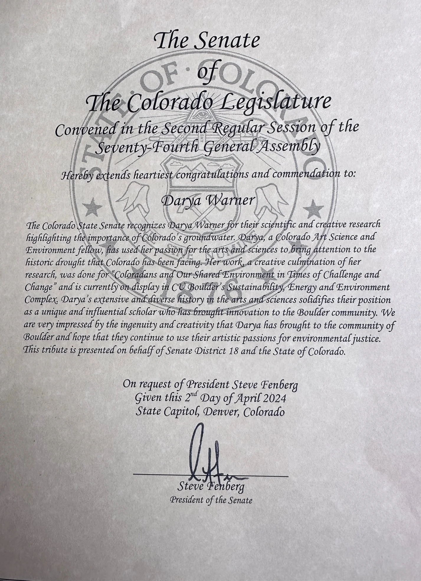 2024 Letter of Commendation from The Senate of The Colorado Legislature recognizing Darya’a Warner for their scientific and artistic research on groundwater in Colorado, CO